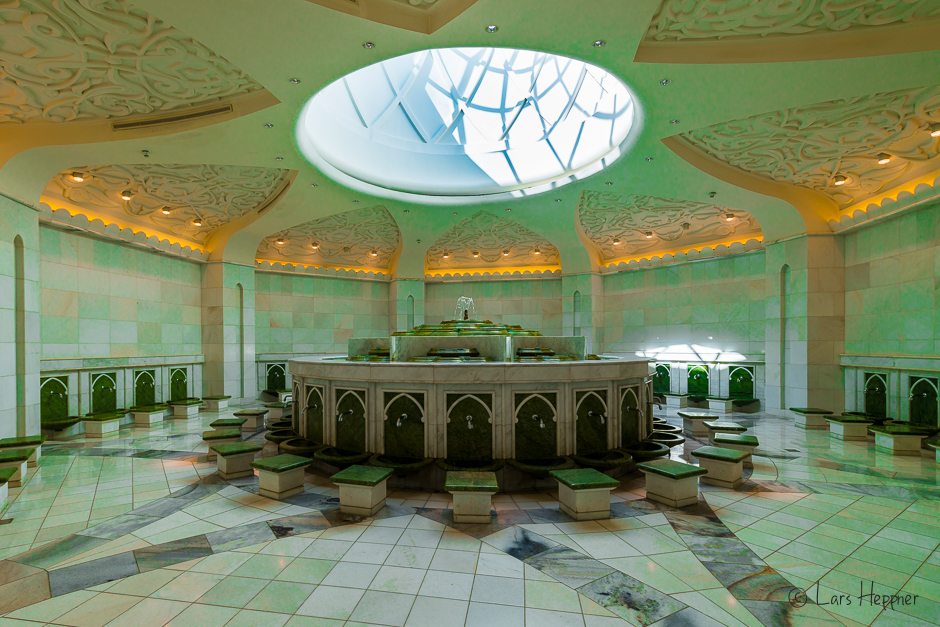 Der erste Besuch der Moschee war am späten Nachmittag. Damit hatten wir ausreichend Zeit die Moschee bei Tageslicht zu erkunden, um dann zum späteren Zeitpunkt die blaue Stunde und den Abend mitzunehmen. Genau das waren die richtigen Tageszeiten, um diese tolle Moschee zu fotografieren. Der Nachteil war allerdings, dass die Moschee sehr voll war, so dass einem immer wieder die Leute durch das Bild gelaufen sind. Dabei war es noch nicht einmal Freitag, der in den Vereinigten Arabischen Emiraten mit unserem Sonntag zu vergleichen ist. Hier pilgern dann noch mehr Menschen in die Moschee.